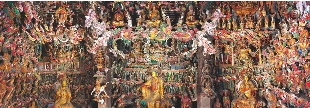 观音堂(GUANYIN TEMPLE):观音堂创建于明万历十年(公元1582年),院内一株古桧柏已有千年历史,仍挺拔茂盛,郁郁葱葱。其正殿三间,墙壁及屋顶梁架、门窗顶部密布描金彩塑、悬塑,现存约500尊,佛祖、菩萨、神仙、圣贤塑像济济一堂,人物刻画入微,既反映了明代儒、释、道三教互相融合,和谐共处的历史,也体现出高超精湛的雕塑艺术。